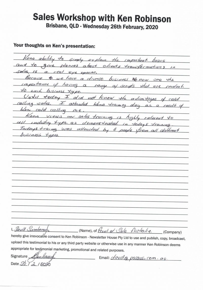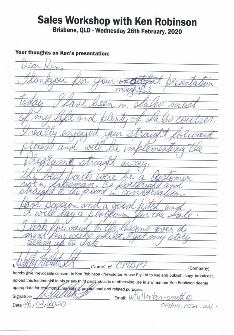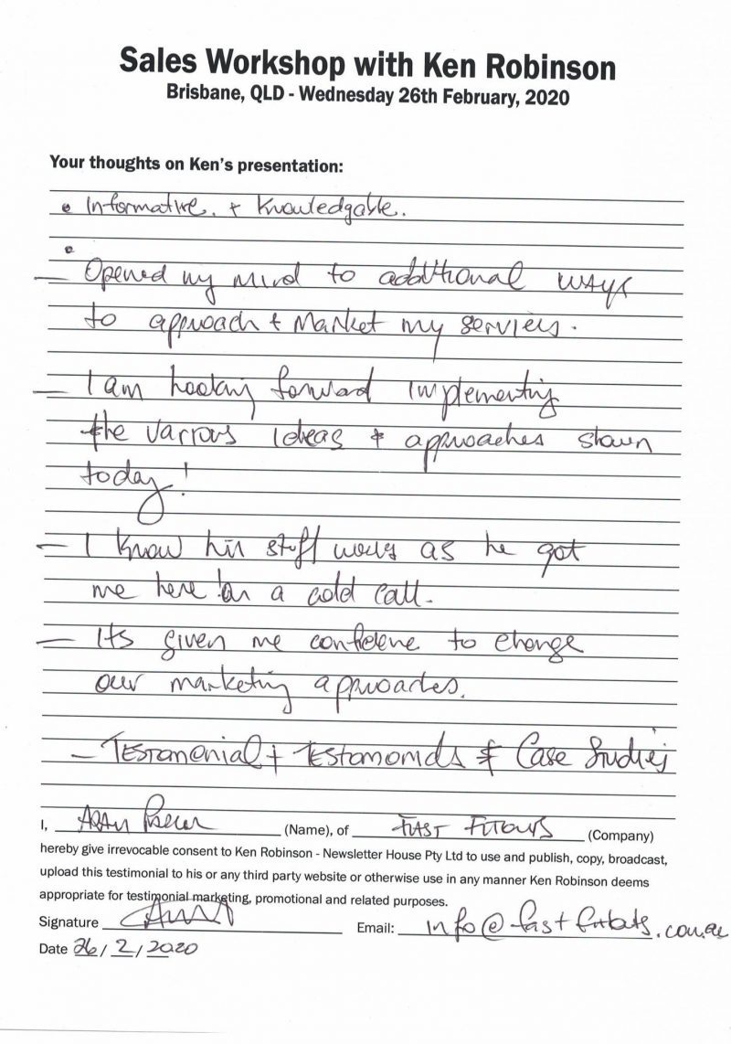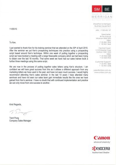 Several years ago, Ken had a sales team from a Canon photocopier dealership attend his one daly sales training workshop.