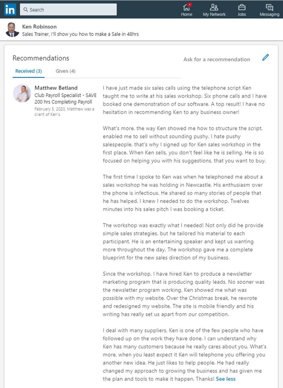 "Ken's workship was informative and knowledgable. Opened my mind to additional ways to approach and market my services. I am looking forward to implementing the various ideas and approaches shown today! I know Ken stuff works as he got me to attend a workshop based on his cold called to me. Today has given me the confidence to change our sales and marketing approaches."