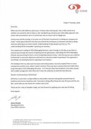 Ken, as you know, most salespeople waste too much time talking to middle managers. Whereas you know how to get through Business Owners, CEOs, Managing Directors, the people who sign orders.